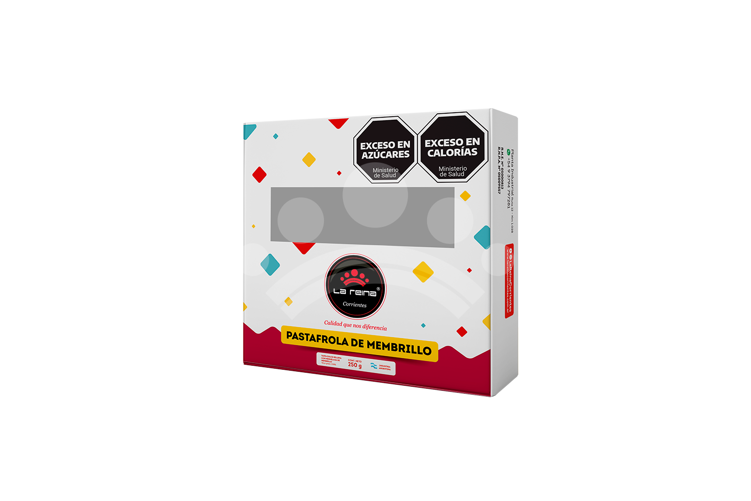Ingredientes: Mermelada de membrillo (pulpa de fruta, jarabe de glucosa, azúcar, acidulante: INS 330, colorante: INS 129), harina de trigo 0000 enriquecida según ley n.º 25.630 (*), azúcar, huevo, compuesto graso de repostería (aceite vegetal refinado, agua, manteca, aceite vegetal parcialmente hidrogenado, jarabe de glucosa, sal, emulsionante: INS 471, saborizante idéntico al natural, conservante: INS 202, acidulante: INS 330, antioxidante: INS 319 y/o INS 321, colorante: INS 160i), polvo de hornear (almidón de maíz, leudante químico: pirofosfato ácido de sodio y bicarbonato de sodio), aromatizante idéntico al natural limón, saborizante: vainilla extra concentrada.
